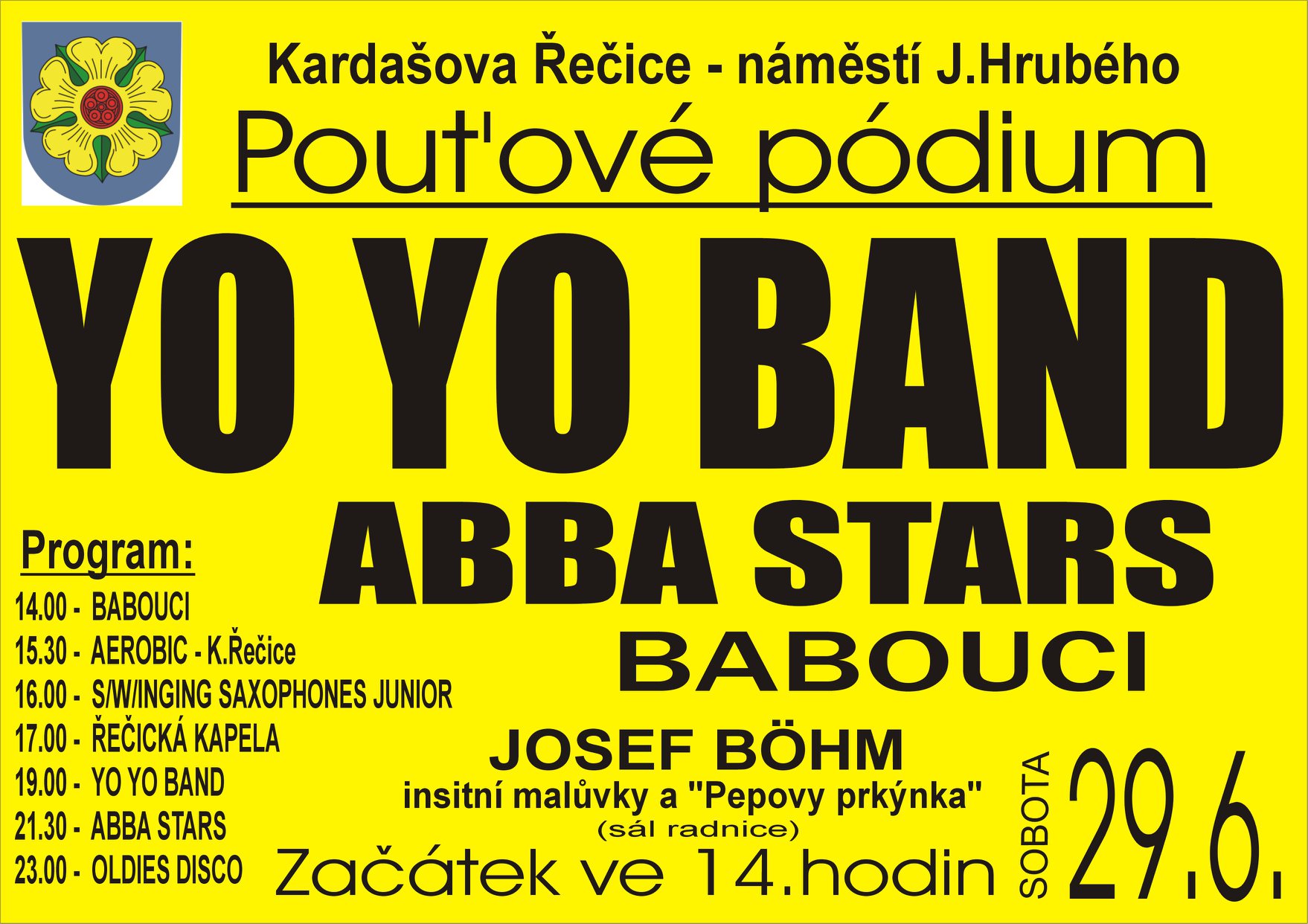 Město Kardašova Řečice vás zve na tradiční „Pouťové pódium“, které se koná v sobotu 29. června 2019 od 14 hodin na náměstí Jaromíra Hrubého. V programu vystoupí BABOUCI, AEROBIC, S/W/INING SAXOPHONES JUNIOR, ŘEČICKÁ KAPELA, YO YO BAND, ABBA STARS a na závěr večera Oldies disco. V radničním sále bude výstava Josefa Böhma „Insitivní malůvky“ a „Pepovy prkýnka“ (plakát v příloze).