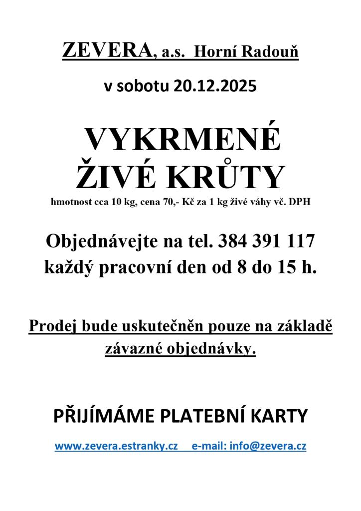 Prodej krůt - Horní Radouň - 20.12.2025 - objednání dopředu na tel: 384 391 117