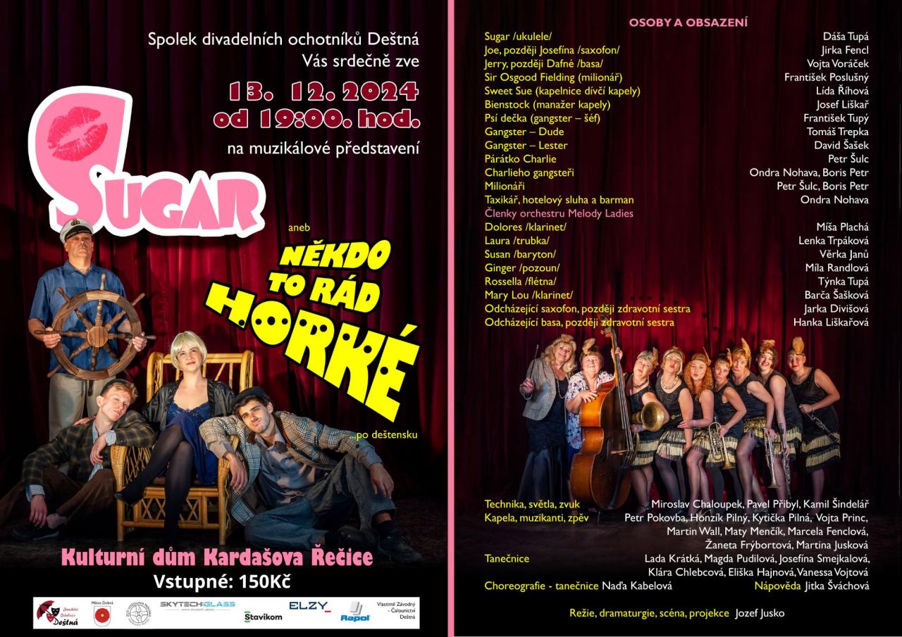 Divadelní spolek Deštná vás zve na představení "Sugar, aneb někdo to rád horké". Přijďte si užít skvělý kulturní zážitek v Kulturním domě Kardašova Řečice.